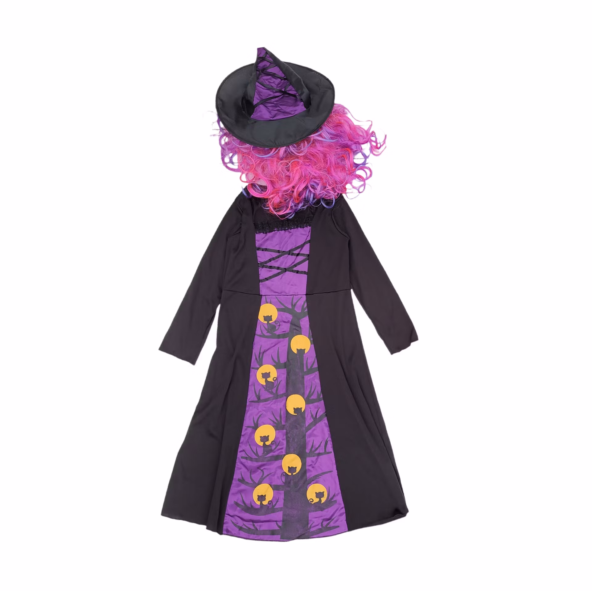 Häxdräkt med peruk, storlek 122/128/134/140, skick C 49 kr Lägg i korgen Information Hål i söm i klänning och hattUppskattad storlek
